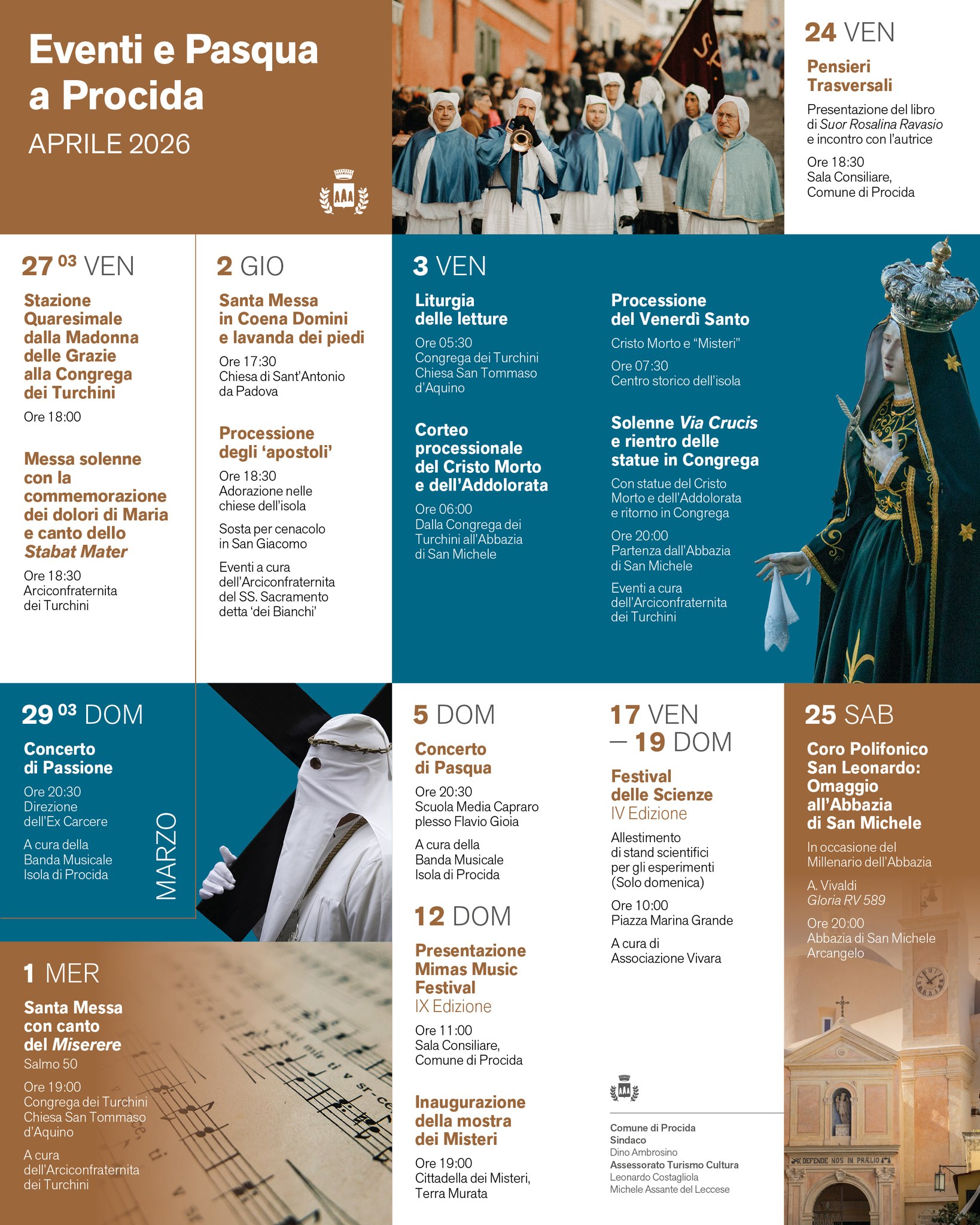 I riti solenni della Settimana Santa a Procida iniziano alle 17.30 di giovedì 2 aprile con la "Messa in coena Domini" e la lavanda dei piedi nella chiesa di Sant'Antonio Abate, per proseguire con la Processione degli Apostoli a partire dalle 18.30.